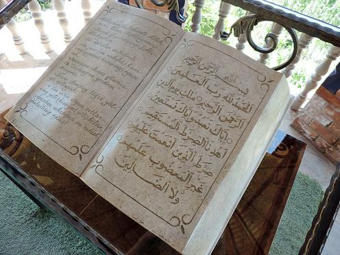 Татьяна Каримованинг ўша жияни масжид тепасида унчалик катта бўлмаган айвонча қурдириб, унинг ичида супа устида қалин ойнак остида улкан мармар Қуръон ўрнатиб қўйди. Унинг очиқ саҳифасида араб тилида “Инсон туғилганида, Аллоҳ унга еттита калит беради. Инсон ҳаётини яшай туриб, еттита эшикни очиб, уларнинг ҳар бирида нур ва яхшилик қолдиришлари керак”, деган ёзув қолдирилган.