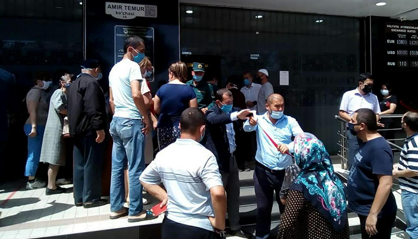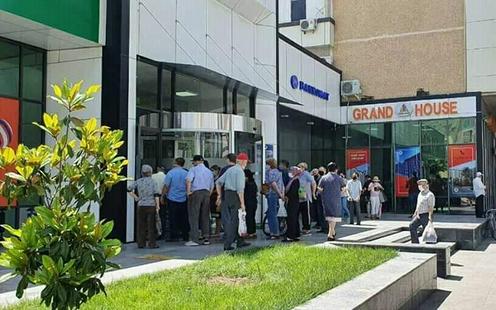 Тошкент шаҳар Юнусобод тумани банк бўлимида пластик карталар олишга навбатда турган одамлар. Facebookдаги "Потребитель.уз" гуруҳидан олинган фотосурат