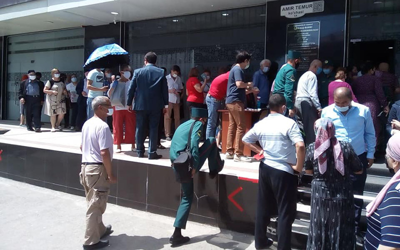 “Ипотека банкнинг Яшнобод филилалида. Эрталаб шунчалик кўп одамлар тўпланганки, на милиция ва на секюрити тартиб ўрната олмади. Ҳеч қандай масофа ҳақида гап ҳам йўқ. Одамлар катта тўппак бўлиб туришибди. На бирор гапни сўраб бўлади ва на билиб бўлади. Банкнинг телефонлари нуқул занит кўрсатади”.