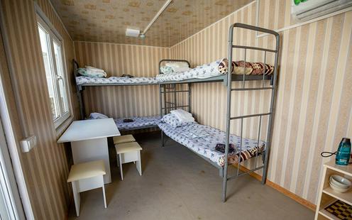 Ётадиган хонада телевизор ва кондиционер ўрнатилган, стационар телефон, электр чойнаги, иккита икки қаватли кровать, стол, тўртта стул, тумбочка, пиёлалар бор. Кўрпа чойшаблари, адёл, сочиқлар тўплами, суюқ совун, шампунь, тиш ювиш пастаси, тиш ювиш чўткаси, ҳожатхона қоғози, қоғоз сочиқлар берилади. Бир кунда уч марта овқат берадилар: котлетлар, қовурилган сабзавот, гарнирга макарон, маржумак (гречка), гуруч, перловка тайёрлашади. Нонуштага – булочка, бўтқалар, салатлар. Одамнинг сонига қараб сув олиб келиб беришади – ҳамма хоналарда ҳам тўрттадан одам яшамайди.
