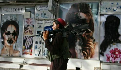 «Толибон» жангари аёллар тасвири аэразол бўёқлари билан «қайта ишланган» гўзаллик салони олдидан ўтиб бормоқда. Aamaj News сайти фотосурати