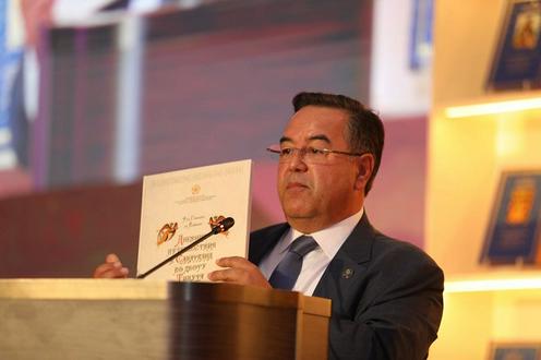 Фирдавс Абдуҳолиқов «Ўзбекистон қўлёзма мероси дурдоналарида тарихий сиймолар» китобини тақдим этмоқда.Ғиёс Жалолов фотосурати