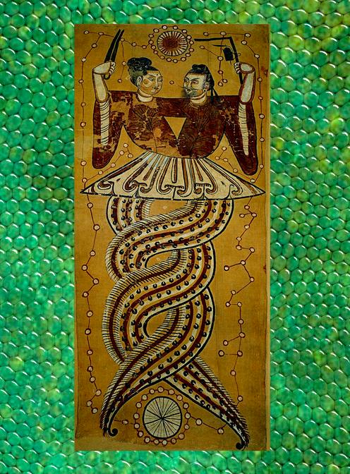 Эҳтимол, бу ерда Хитой мифологияси билан боғлиқ янада қадим культлар ўз аксини топган. Хитой халқининг афсонавий аждодлари Нюйва ва Фуси ярим одам, ярим илон жонзот сифатида тасвирланган. Уларнинг танаси ва боши одатда одам (баъзан буқа), пастки қисми эса илонга ўхшайди. Хан сулоласи қабрларида Нюйва ва Фуси илон думларини бир-бирига боғлаб турадиган барельефлар мавжуд, Фуси эркак сифатида қўлида Қуёшни, Нюйва аёл сифатида Ойни ушлаб туради.