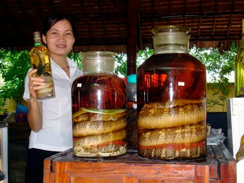 Қизиғи шундаки, Хитойда вино ва ароқ нафақат кичик заҳарли илонлар, балки ҳатто катталар питонлари билан ҳам тўлдирилган идишларда тайёрланади. Албатта, улар оддий шишаларга эмас, балки одам бўйи баланд циклоп ўлчамидаги шиша идишларга жойлаштирилади.