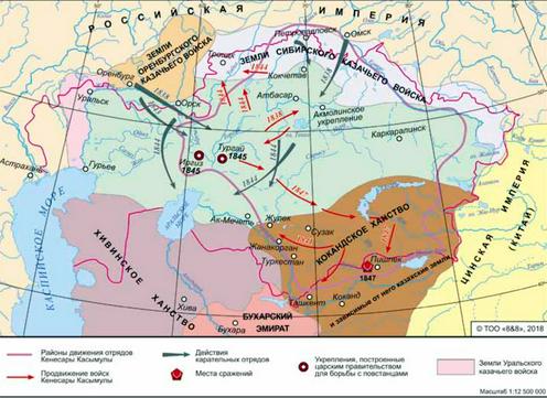 Кенесари чор ҳукматидан тортиб олинган кўчманчилар ерларини қайтаришни ва Россияга бўйсунмаган, фақат империя билан иттифоқдош бўлган мустақил қозоқ давлатини тан олишни талаб қилади. Санкт-Петербургдагилар эсамуроса қилишга мойил эмасдилар – даштда бир қанча истеҳкомлар қуриб, чор қўшинлари Россия ҳукуматига содиқ қозоқ султонлари билан биргаликда Кенесарини жанубга, Сарису ва Чу дарёлари томон чекинишга мажбур қиладилар. Бу ерда Катта Жузнинг кўчманчи лагерлари жойлашган бўлиб, уларнинг султонлари 1846 йили Россия тожига содиқликка қасамёд қилгандилар. Кенесари эса қўлга олинган ерлар билан ҳақ тўлашни ваъда қилиб, уларнинг бир қисмини Қўқонга қарши урушга сафарбар қилади. Қўқоннинг бир қанча қалъаларини эгаллаб олишига қарамай, қўшинларида вабо тарқалган Кенесари кўп ўтмай жануби-ғарбга, Или дарёсининг нариги томонига чекинади. Бу ердан у руслар ўша пайтдаги қирғиз ёки қора қирғизларга қарши юриш бошлайди.
