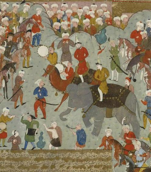 Афшин Араб халифалиги пойтахтида асир Ҳасан Бабек (фил устида) ва унинг укаси Абдуллоҳни (туя устида) олиб кетмоқда. Х аср тарихчиси Абу Али Муҳаммад Баламининг «Тарихнома» асаридаги Ўрта аср миниатюраси