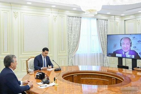 Мирзиёев видеоконференцалоқа форматида Сума Чакрабарти билан суҳбатлашмоқда. Президент матбуот хизмати фотосурати