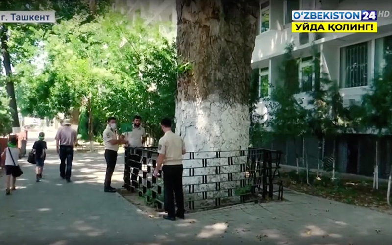 Тошкентда панжара билан ўраб қўйилган ёши бир асрдан ошган чинор дарахти. “Ўзбекистон 24” телеканалидан олинган сурат