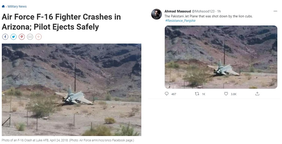 Бундан ташқари, Аҳмад Маъсуд Twitter тармоғидаги саҳифасида суратлар чоп этган. Унинг сўзларига кўра, суратларда қаршилик кучлари томонидан уриб туширилган Покистон ҳарбий самолёти акс этган. Бироқ, аслида бу сурат 2018 йил апрель ойида талофатга учраган АҚШнинг F-16 самолётига таалуқлидир.
