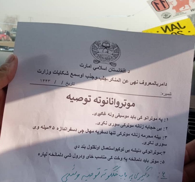Афғонистонда ҳокимиятни қўлга киритган «Толибон»* радикал ҳаракати автомобилларда мусиқа тинглашни тақиқловчи ва аёлларни элтиб қўйишни чекловчи фармон чиқарди. Ҳужжатнинг асл нусхасини афғон журналисти Билол Сарварий ўзининг Twitterдаги саҳифасида эълон қилди.