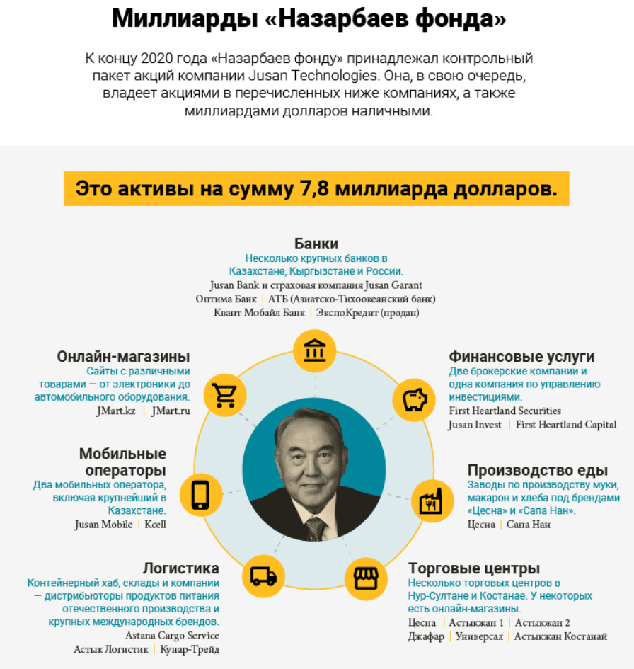 «Активларнинг бир қисми биринчи президентнинг ҳукмронлиги даврида гуллаб яшнаган олигархлардан Назарбоев фондлари назоратига ўтган (баъзилари ҳамон биргаликдаги эгадорлар тасарруфида). Кейинчалик маблағлар ҳисобидан сотиб олинган хусусий компанияларнинг бир қисми Қозоғистон ҳукумати томонидан молиялаштирилган. Ҳозир Назарбоев маблағлари кўплаб халқаро конгломератларга қараганда кўпроқ корхоналарни назорат қилади», — дея таъкидлайди текширув муаллифлари.