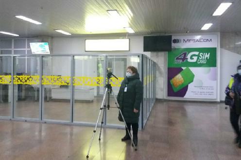 Манас аэропортида тепловизор ёрдамида инсонлардаги юқори ҳароратни аниқлаётган ходим. Александра Мельникова фотосурати, «Фарғона»