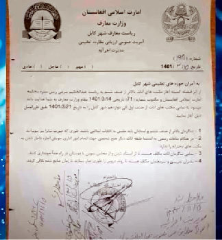 Эслатиб ўтамиз, янги ўқув йилидан бошлаб, яъни 2022 йил 23 мартдан барча ёшдаги қизлар учун мактаблар очиш ҳақидаги кўплаб ваъдаларга қарамай, «Толибон» ҳаракати қизларга фақат бошланғич синфларда, 6-синфгача бўлган дарсларга боришга рухсат берди. 12 ёшдан ошган ўрта ва ўрта мактаб ўқувчилари мактабларга боришлари мумкин эмас. Шу билан бирга, барча ёшдаги ўғил болалар дарсларга боришлари мумкин.