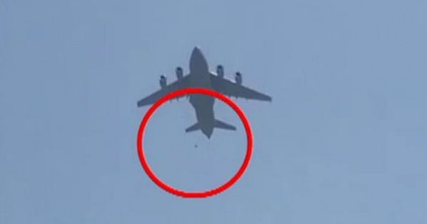 Қобулдан ҳавога кўтарилган АҚШ ҲҲК самолётидан қулаб тушаётган одам, 2021 йил август. Ижтимоий тормоқ видеосидан кадр