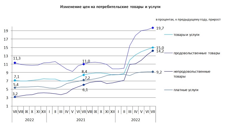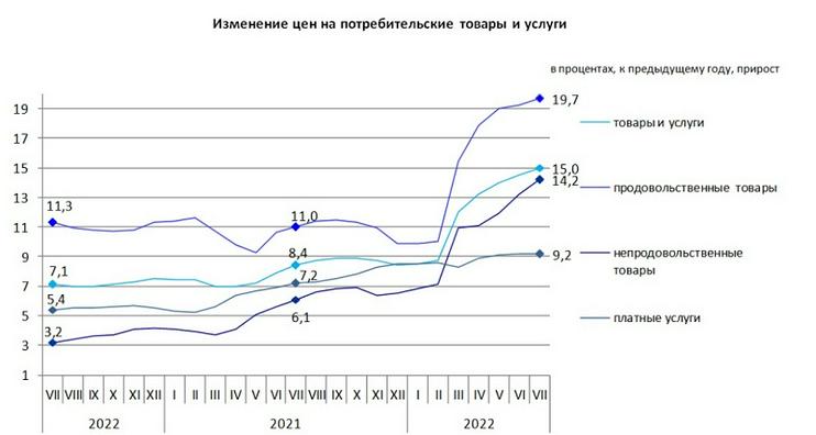 Умуман олганда, июль ойида йиллик инфляция 15 фоизни ташкил этган. Июнь ойида нархларнинг йиллик ўсиши 14,5 фоизни, май ойида эса 14 фоизни ташкил этган.