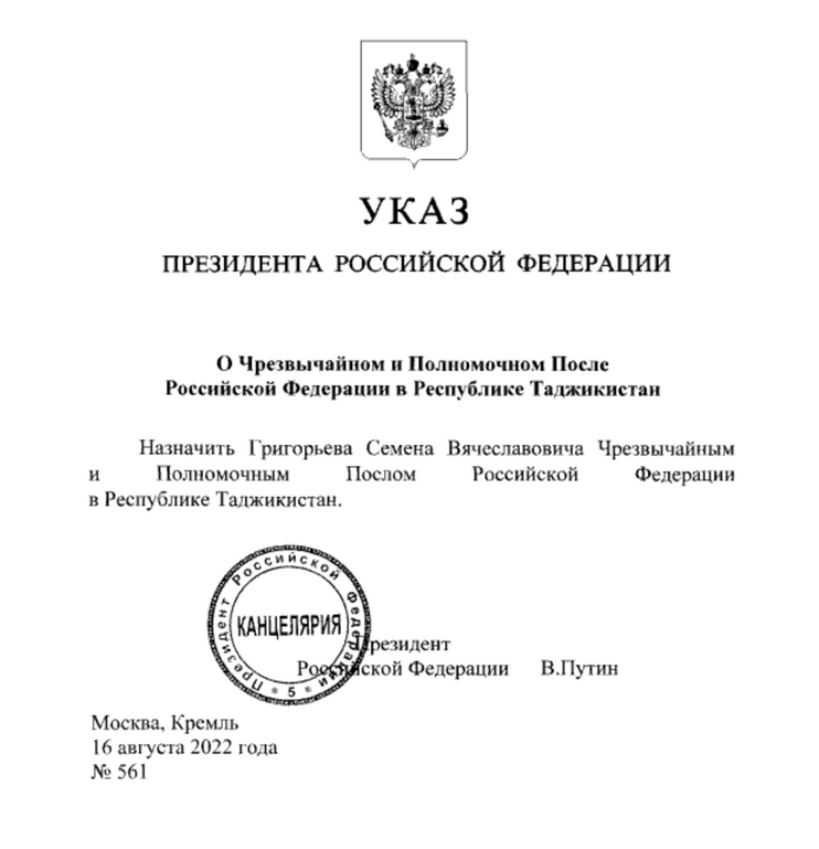 2022 йил 16 август куни президент Владимир Путин Игорь Лякин-Фроловни Россиянинг Тожикистондаги элчиси лавозимидан озод қилди. Бу лавозимга малакали дипломат Семён Григорьев тайинланди. Тегишли қарорлар ҳуқуқий ахборот порталида эълон қилинган.