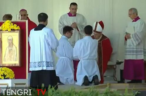 Nur.kz хабарига кўра, маросим иштирокчилари понтифик билан биргаликда бир соатдан ортиқ вақт давомида дуо ўқишган. Шундан сўнг, Муқаддас Отадан Қозоғистонга фотиҳа бериш сўралган, понтифик дуо қилган. Шунингдек, у Қозоғистонга муқаддас ибодат учун коса совға қилган.