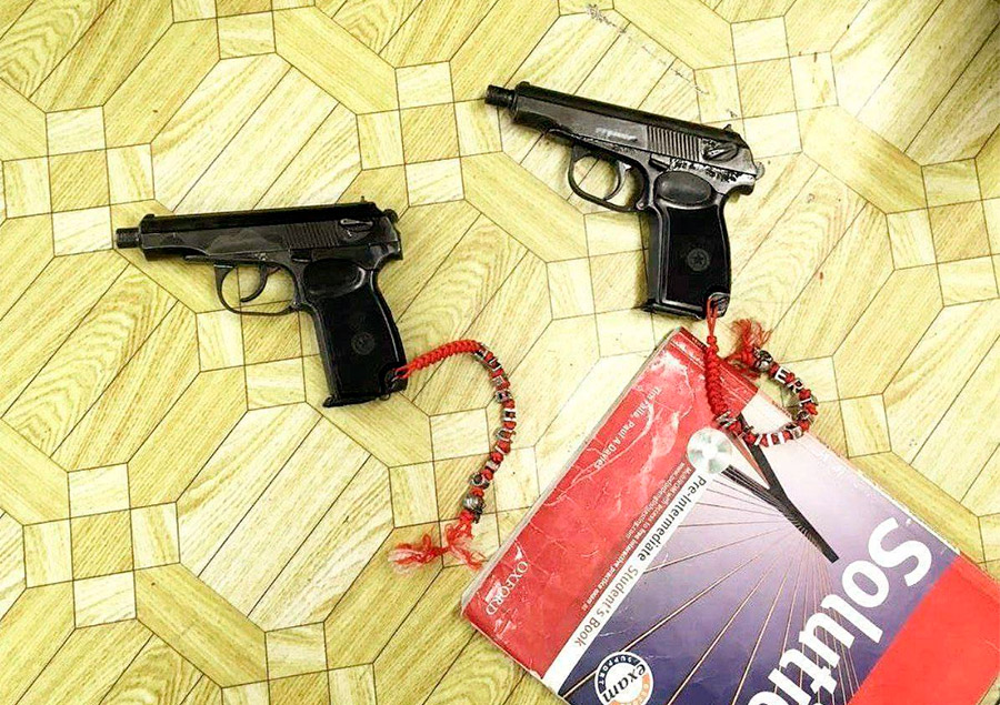 Baza нашрига кўра, қотилнинг иккала тўппончасида ҳам қўлбола брелоклар бўлган. Улардан бирига «Эрик» ва «Дилан» сўзлари (АҚШнинг Колорадо штатидаги «Колумбайн»* мактабида отишма содир этганларнинг номи шундай бўлган) битилган. Иккинчисига эса лотин ҳарфларида «Колумбайн» сўзи ёзилган. Қуролларнинг ўқ солинадиган қисмига Казанцев «нафрат» сўзини ёзиб қўйган.