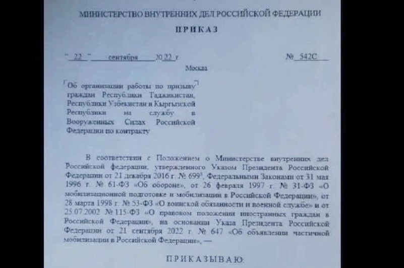 Учала хабарда ҳам интернетда тарқалаётган Россия Ички ишлар вазирлигининг сохта буйруғи тилга олинган. Унга таяниб, нохолис шахслар Россияда Ўзбекистон, Тожикистон ва Қирғизистон фуқаролари қисман сафарбарликка жалб этилаётганини ёзишмоқда. Уларга кўра, гўёки фуқаролар шартнома тузишдан бош тортишса, уларнинг ишлаш учун рухсатномалардан маҳрум бўлиши ва депортация қилиниши мумкинлиги хавфи бор эмиш.