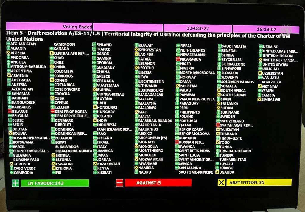 Резолюцияни ёқлаб 143 давлат овоз берди, 5 давлат қарши, 35 давлат бетараф қолди.