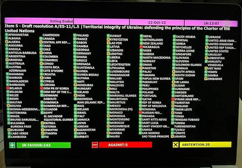 Бирлашган Миллатлар Ташкилоти (БМТ) Бош Ассамблеяси Украинанинг Донецк ва Луганск халқ республикалари (ДХР ва ЛХР), Херсон ва Запорожье вилоятларининг Россия таркибига қўшилиш бўйича ўтказилган референдумларни тан олмаслик тўғрисидаги резолюцияни қабул қилди. Овоз бериш Москва вақти билан 12 октябрдан 13 октябрга ўтар кечаси бўлиб ўтди.