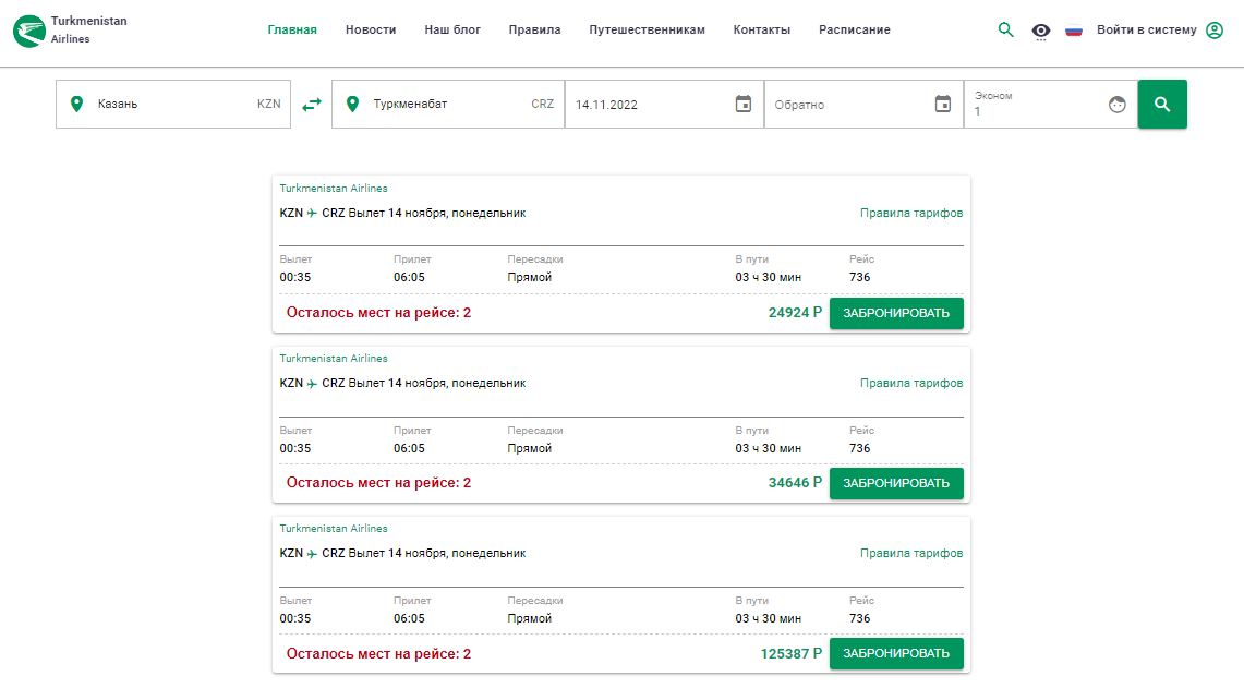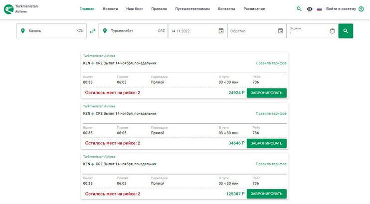 Шундай қилиб, 18 октябрь куни 14 ноябрги Қозондан Туркманободга А30/ТМ тарифида эконом-класс чипталарини (фақат Россия Федерацияси ҳудудида туркман фуқароларига сотилади) веб-сайтда 24,9 минг рублга ($403) сотиб олиш мумкин. H30D/wekillk тарифида бир хил рейсга эконом класс чипталари (Россия Федерацияси ва бошқа давлатлар фуқаролари учун фақат Россияда) 34,6 минг рубл (560 доллар)га сотилмоқда.