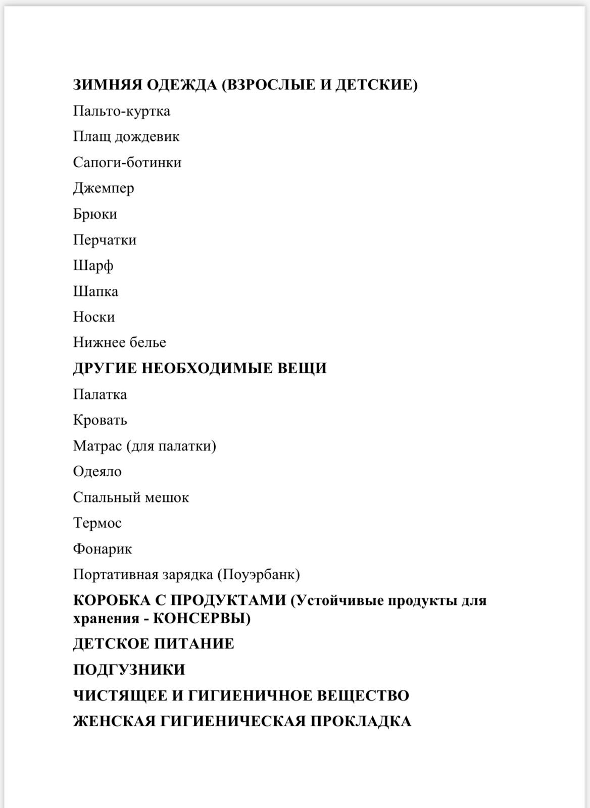 Эълонда энг керакли нарсалар рўйхати келтирилган: қишки кийим, ички кийим, консерва, болалар овқатлари, шахсий гигиена воситалари, тагликлар. Шунингдек, чодирлар, кўрпа-тўшаклар, матраслар, ухлаш учун қоп кўрпачалар, чироқлар, термослар, қувватлантирувчи ускуналар ҳам талаб қилинади.