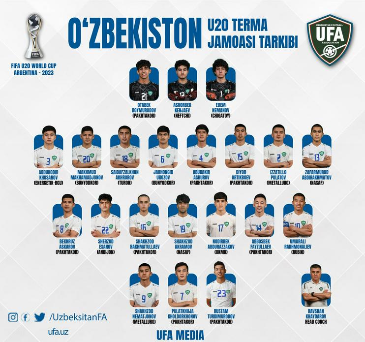 Футбол бўйича Ўзбекистон ёшлар терма жамоаси бош мураббийи Равшан Ҳайдаров Аргентинада бўлиб ўтадиган U-20 жаҳон чемпионатига йўл оладиган жамоа таркибини аниқлади. Футболчилар номи Республика Миллий олимпия қўмитасининг расмий сайтида эълон қилинган.
