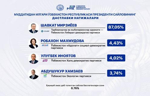 Марказий сайлов комиссияси маълумотларига кўра, Мирзиёевга 13,6 миллиондан ортиқ ўзбекистонлик овоз берган. Унинг рақобатчилари сезиларли даражада орқада: