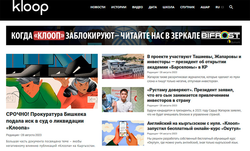 ℹ️ Kloop мустақил нашри 2006 йилдан бери фаолият юритади ва унинг учта ваколатхонаси бор — Бишкек, Ўш ва Варшавада. Нашрда 70 га яқин киши ишлайди. Нашр тўрт тилда – рус, қирғиз, инглиз ва ўзбек тилларида долзарб воқеаларни ёритади, текширувлар ўтказади, сайлов кузатувларини ташкил этади ва мультимедиа контентини яратади. Kloop иштирокидаги энг шов-шувли текширувлардан бири 2019 йили чоп этилган бўлиб, унда Қирғизистон божхонасидаги йирик коррупция ҳақида сўз боради. Kloop бир неча бор Қирғизистон расмийларининг босимига дуч келган ва асосий ресурс блокланган тақдирда ўз материалларини такрорлайдиган акс кўзгу-сайтини яратган.