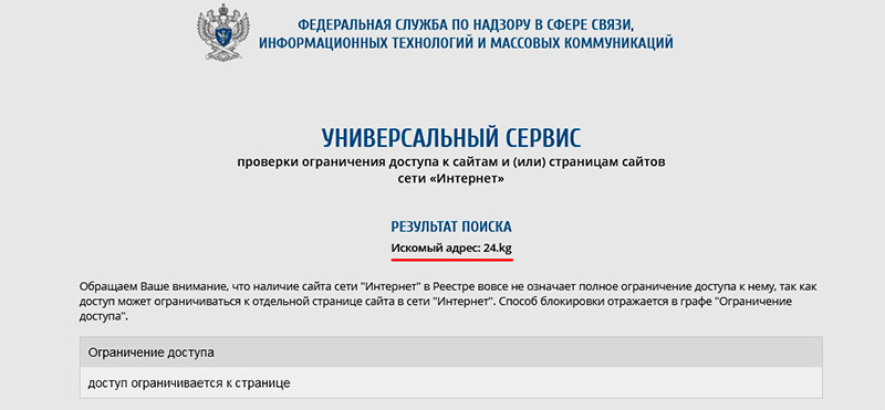 Роскомнадзор веб-сайтининг таъкидлашича, «сайт саҳифасига кириш чекланган», аммо Россияда нафақат дайжестлар, балки 24.kg нинг бошқа саҳифалари, шу жумладан бош саҳифаси ҳам юкланмайди.