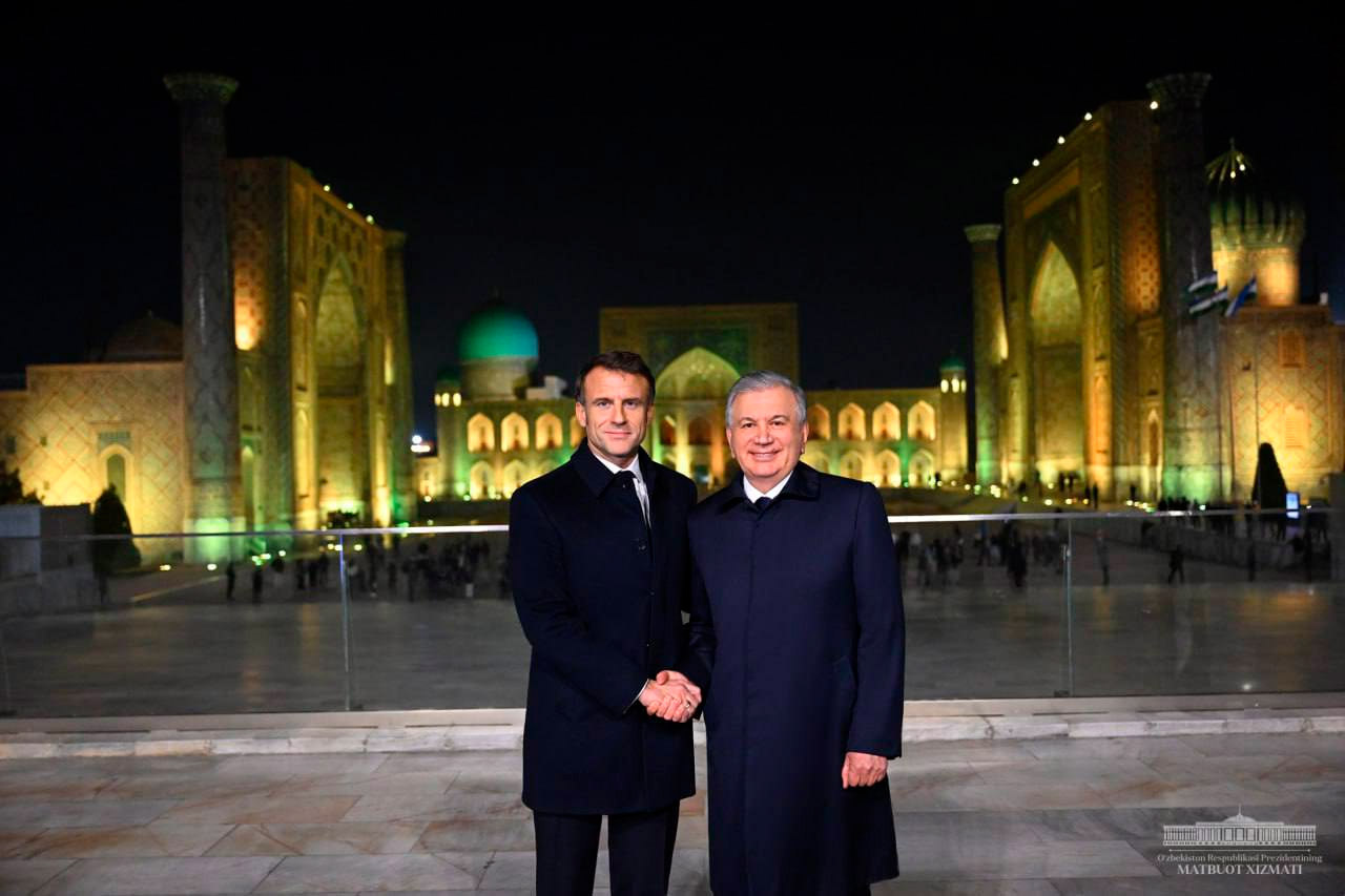 Макрон 1 ноябрь куни расмий ташриф билан Ўзбекистонга келди, у таркибида расмийлар, етакчи компаниялар раҳбарлари, таниқли маданият ва фан арбобларидан иборат делегациясига бошчилик қилди. Ташрифнинг биринчи нуқтаси Шавкат Мирзиёев ҳамроҳлигида Самарқанд бўйлаб тунги сайр қилиш бўлди. Президентлар Регистон майдонида биргаликда суратга тушди, сўнг «Буюк ипак йўли» халқаро сайёҳлик марказидаги «Абадий шаҳар» тарихий-этнографик боғига ташриф буюришди.