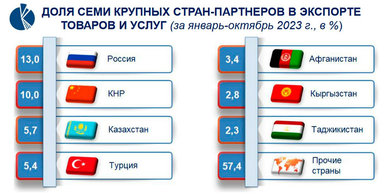 Ташқи савдо айланмасининг энг катта ҳажми Хитой (21,2 фоиз), Россия (15,6 фоиз), Қозоғистон (7,0 фоиз), Туркия (5,1 фоиз) ва Корея Республикаси (3,7 фоиз) билан қайд этилган.