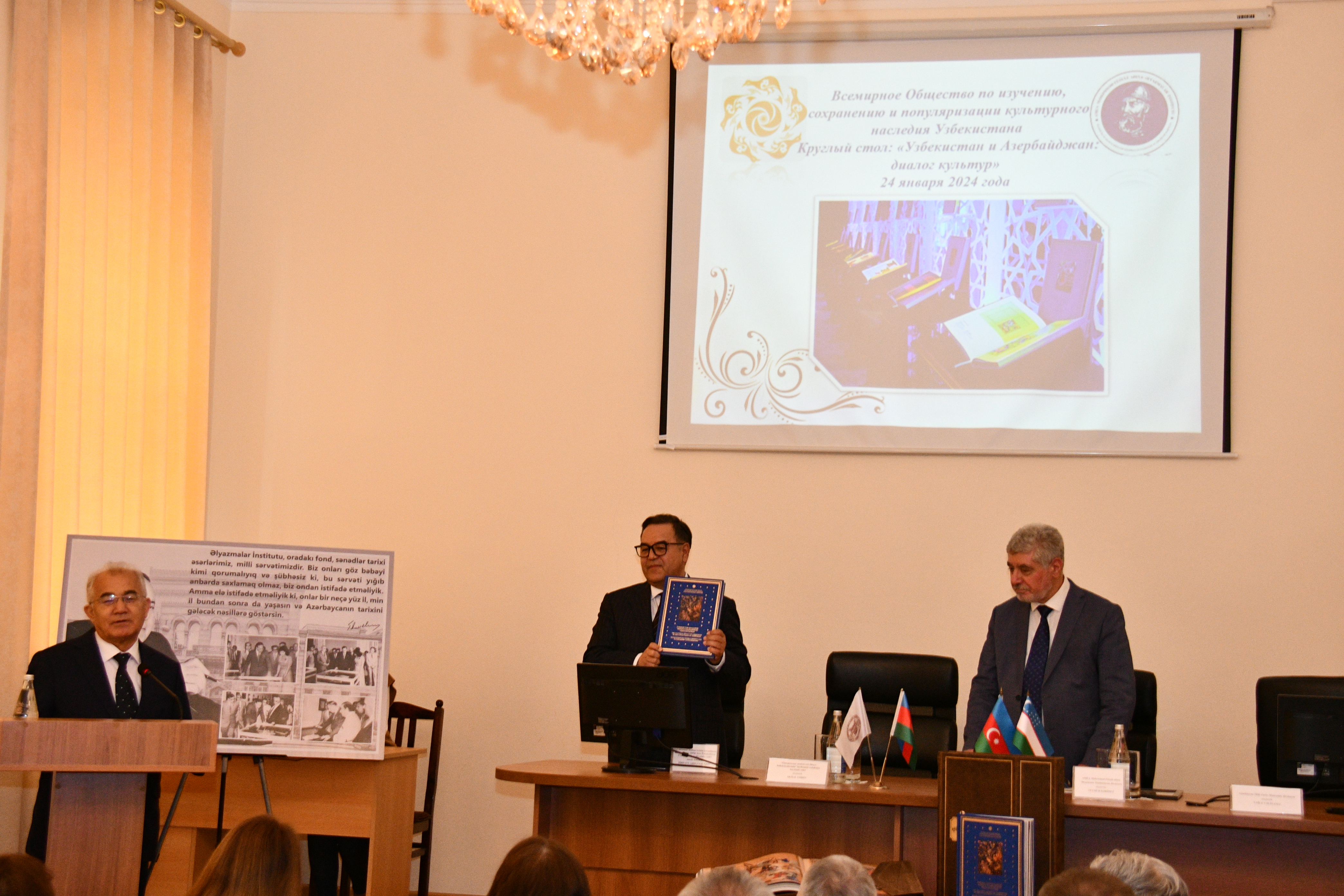 Тадбир давомида «Ўзбекистон маданий мероси жаҳон тўпламларида» номли 50 жилдли иллюстратация китоб-альбомларни Озарбайжон тарих, санъат ва гилам музейлари ҳамда Қўлёзмалар институтига топшириш маросими бўлиб ўтди. Китоб-альбомларни олиш учун сертификатларни академик, лойиҳа таҳририяти раиси Акмал Саидов топширди.