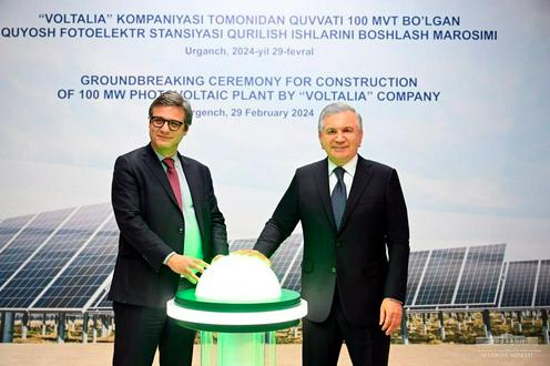 Ўзбекистон президенти Шавкат Мирзиёев ва Voltalia компанияси бош директори Себастьен Клэр ФЭС қуриилишига старт бермоқдалар. president.uz сайти фотосурати