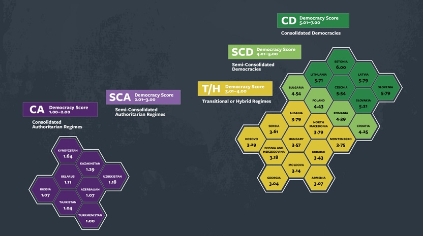 Болтиқбўйи давлатлари, Чехия, Словакия ва Словения рўйхатнинг юқори поғоналаридан жой олган. Ушбу давлатларда демократия даражаси 7 баллдан 5,20 дан 6 баллгача диапазонда баҳоланади.