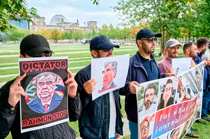 Тожикистон президенти Эмомали Раҳмоннинг Берлинга ташрифига қарши чиққан акция иширокчилари, 2023 йил 29 сентябрь. hrw.org айти фотосурати