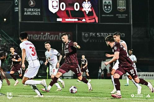 «Актобе» ўз майдонидаги илк учрашувда кутилмаганда Босниянинг «Сараево» жамоасига 0:1 ҳисобида имкониятни бой берди. Бироқ, экспертларнинг фикрига кўра, вазият умидсиз эмасди, чунки қозоқлар ўзларини осонгина тиклаб олишлари мумкин эди. Аввалига шундай ҳам бўлди. 41-дақиқада Идрис Умаев меҳмонларни ҳисобда олдинга олиб чиқди. Иккинчи бўлим бошида сараеволиклар ҳисобни тенглаштирган бўлса, 75-дақиқада Одилхон Танжариков ўйинни қўшимча бўлимга ўтказди. 93-дақиқада Жайро Жан ҳисобни 3:1, «Актобе» фойдасига ҳал қилган бўлса, орадан уч дақиқа ўтиб боснияликлар ҳисобдаги фарқни қисқартиришди. Икки бўлим якунида ҳисоб 3:3 бўлди. Пеналтилар сериясида «Сараево» ўйинчилари аниқроқ ҳаракат қилишди.