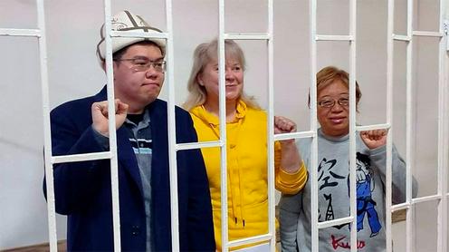 Чапдан ўнгга: Темирлан Султанбеков, Ирина Карамушкина ва Роза Турксевер. Kloop.kg Telegram-канали фотосурати