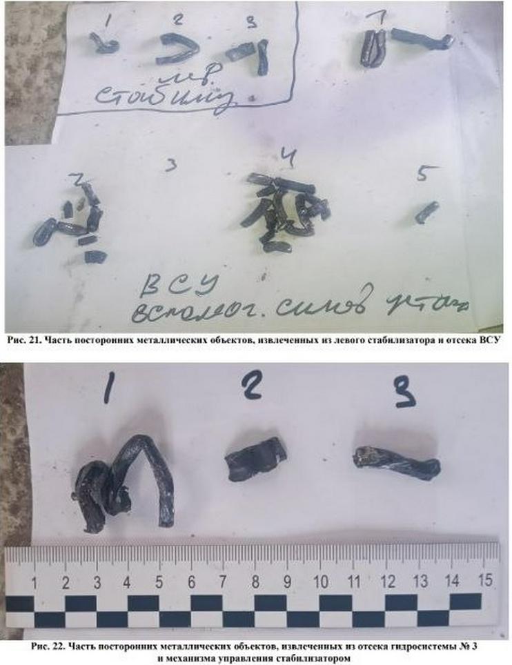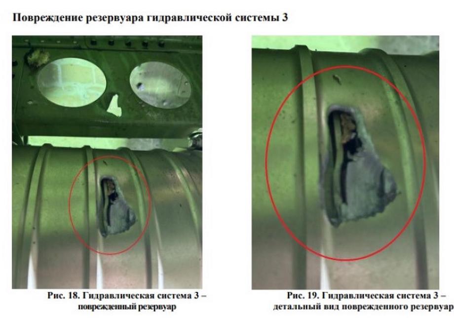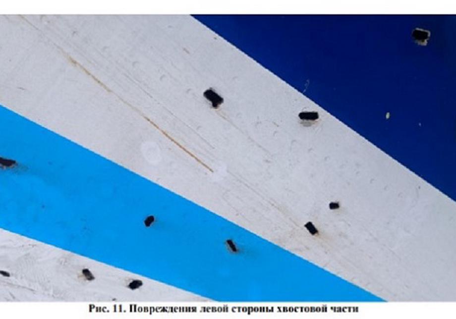 «Омон қолган парчаларни дастлабки текширишда фюзелажнинг дум қисмида, кил ва стабилизаторда, баландлик ва йўналиш рулларида турли ўлчам ва шаклдаги кўп сонли шикастланишлар аниқланган. Худди шундай шикастланишлар самолётнинг чап двигатели ва чап қанотида, шунингдек, самолёт агрегатлари ва қисмларида топилган. Баъзи жойларда кўрилган зарар мунтазам тўртбурчак шаклга эга», — дейилади ҳужжатда.