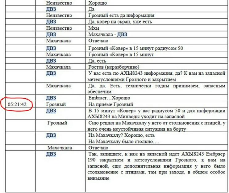 Ҳисоботда Грозний, Ростов-Дон ва Актаудаги AZAL учувчилари ва диспетчерлари ўртасидаги суҳбатлар (уларнинг стенограммаси аввалроқ BAZA Телеграм канали томонидан эълон қилинган) ўрин олган. Улардан маълум бўлишича, россиялик диспетчерлар экипажга Россия ҳудудига фавқулодда қўниш учун бир нечта вариантни таклиф қилган, бироқ учувчилар Бокуга қайтишга қарор қилган. Кейин бошқарув тизимларининг ишдан чиқиши туфайли улар бир неча бор қарорларини ўзгартириб, охир-оқибат Ақтауга учиб кетишган.