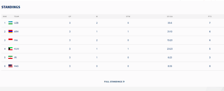 ℹ️ Хоккей бўйича жаҳон чемпионатининг IV дивизиони 13-19 апрель кунлари Ереванда бўлиб ўтмоқда. Турнирда Арманистон, Ўзбекистон, Эрон, Қувайт, Индонезия ва Малайзия терма жамоалари иштирок этади. Ҳар бир жамоа ўз рақибига қарши биттадан ўйин ўтказади. Гуруҳда биринчи ўринни эгаллаган жамоа юқорига кўтарилади.