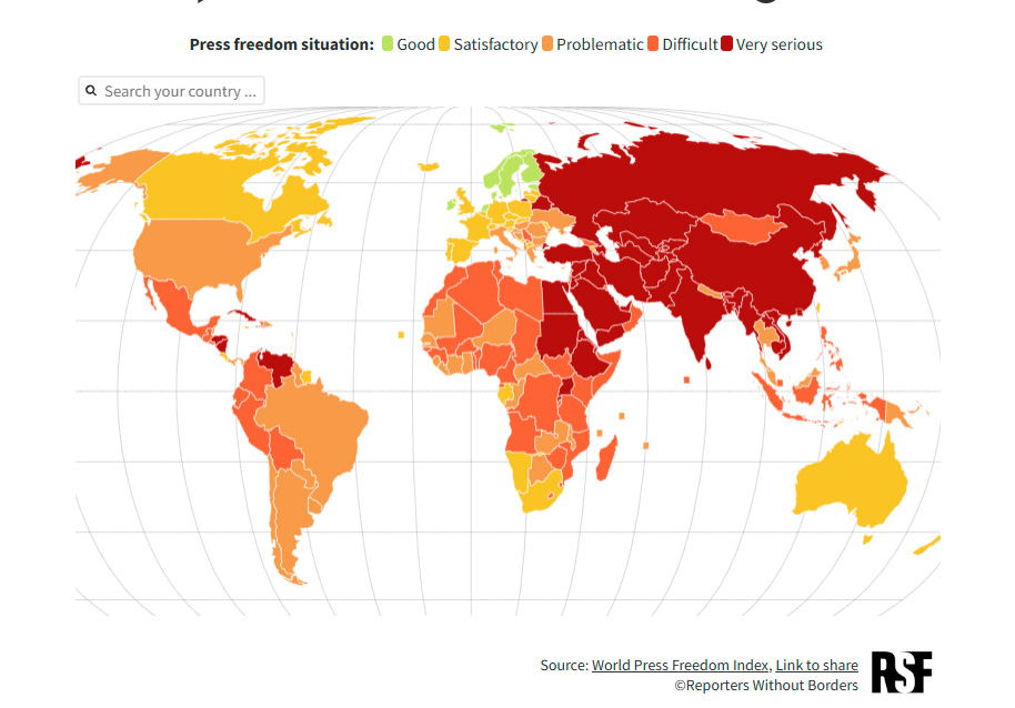 2025 йили дунёда матбуот эркинлиги билан боғлиқ вазият биринчи марта «мураккаб» бўлган – журналистик фаолият учун шарт-шароитлар мамлакатларнинг ярмида ёмонлашган ва ҳар тўртта давлатдан бирида қониқарли бўлган. Оммавий ахборот воситалари таҳририят мустақиллигини сақлаб қолиш ва иқтисодий омон қолиш ўртасида қолиб кетган.