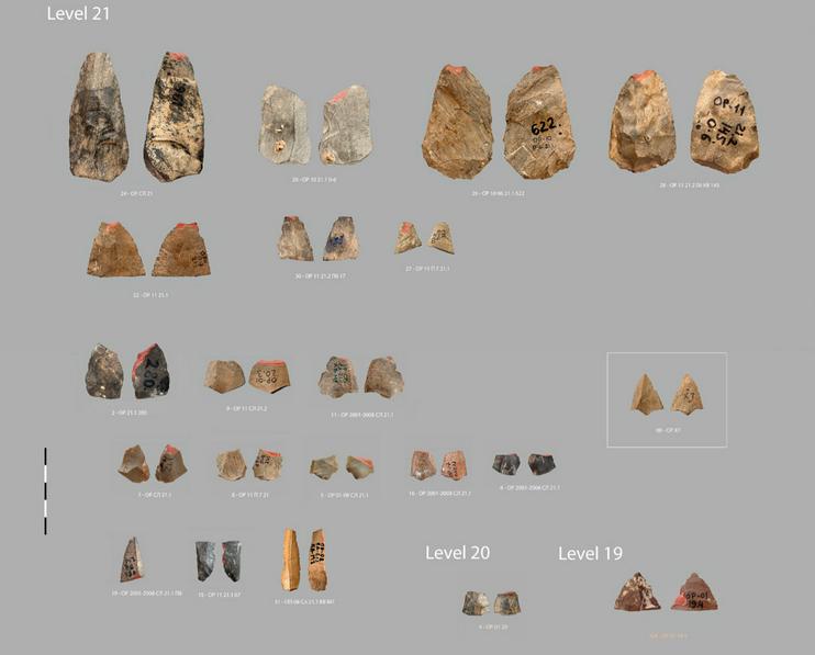 Россия Фанлар академиясининг Сибир бўлими (РФА СБ) Археология ва этнография институтидан Андрей Кривошапкин бошчилигидаги халқаро тадқиқотчилар гуруҳи ғорнинг қадимий қатламларидан икки юзга яқин миниатюра артефактларини таҳлил қилганлар, улар орасидан йигирмата мумкин бўлган ўқ-ёйлар учлари ва уларнинг парчалари аниқланган (тадқиқотнинг тўлиқ матни PLOS.ONE журналида эълон қилинган).
