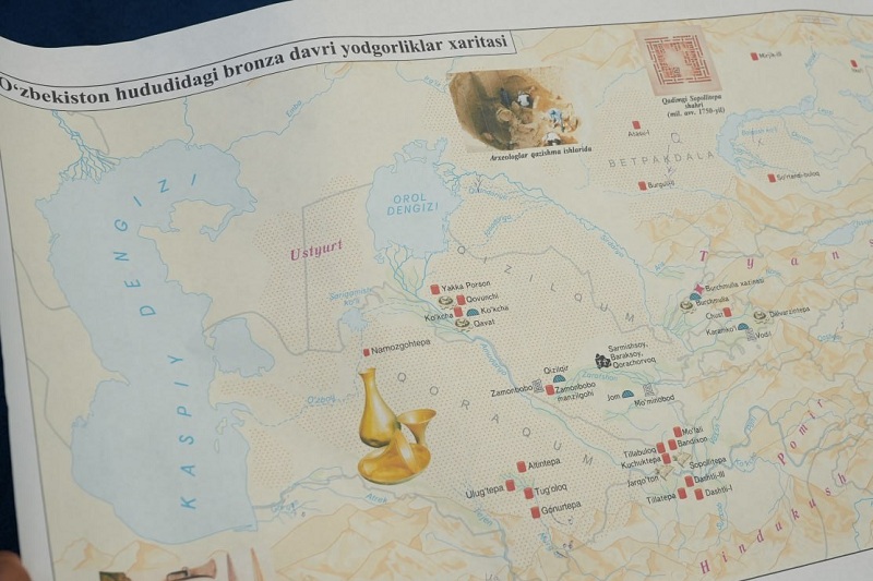 Масалан, алоҳида хариталарда палеолит даври ғорлари, бронза даври маданияти, шунингдек, Бақтрия, Сўғд, Хоразм ва Фарғона акс эттирилади. Кейинги босқичларда Кушонлар давлати, Турк хоқонлиги, Эфталитлар ва Ўзбек хонлиги даврлари тасвирланади.