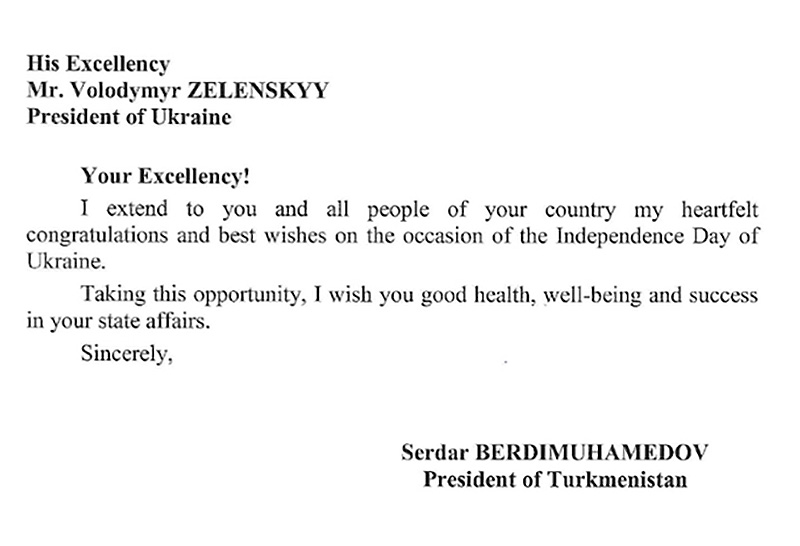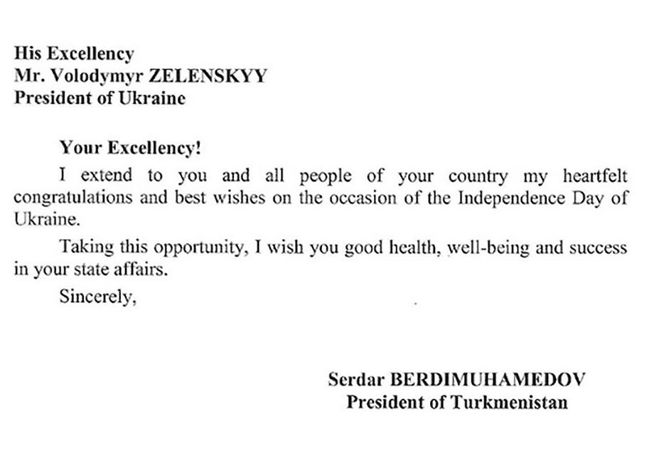«Жаноби Олийлари! Сизни ва бутун мамлакат халқини Украина Мустақиллиги куни билан чин қалбимдан табриклайман. Фурсатдан фойдаланиб, Сизга мустаҳкам соғлик, фаровонлик ва давлат ишларида муваффақиятлар тилайман», — дейилади Туркманистон президенти Сердар Бердимуҳамедов телеграммасида.