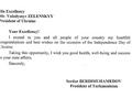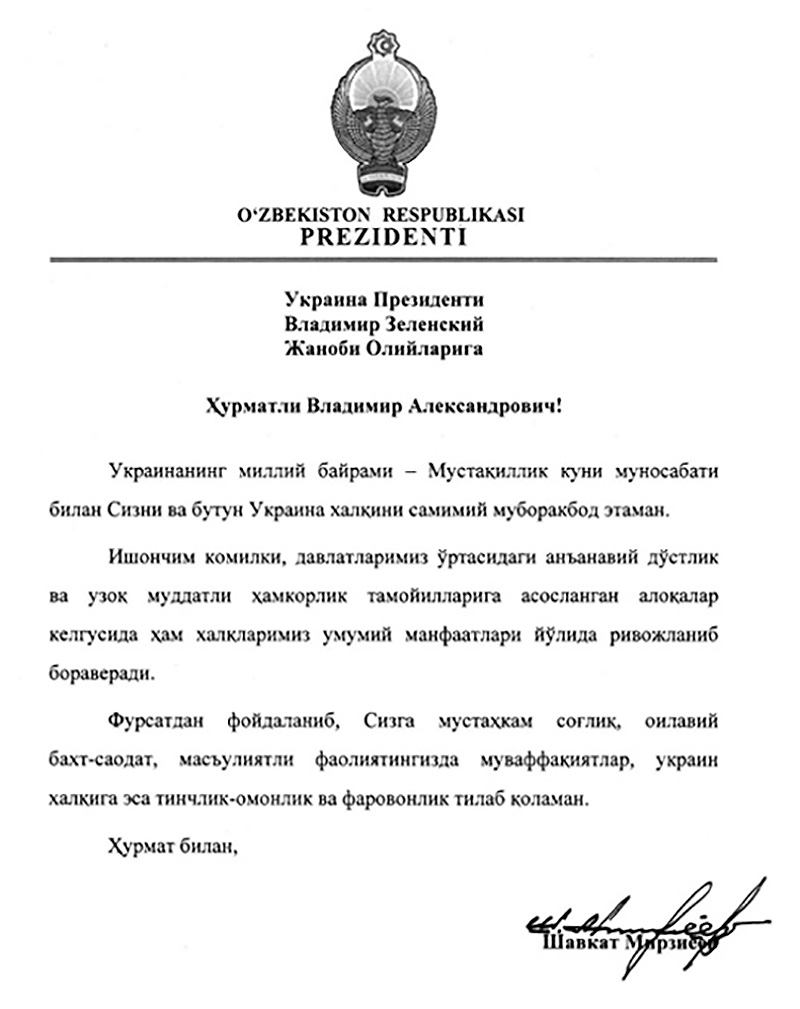 «Украинанинг миллий байрами Мустақиллик куни муносабати билан Сизни ва бутун Украина халқини самимий муборакбод этаман. Ишончим комилки, давлатларимиз ўртасидаги анъанавий дўстлик ва узоқ муддатли ҳамкорлик тамойилларига асосланган алоқалар келгусида ҳам халқларимиз умумий манфаатлари йўлида ривожланиб бораверади. Фурсатдан фойдаланиб, Сизга мустаҳкам соғлиқ, оилавий бахт саодат, масъулиятли фаолиятингизда муваффақиятлар, украин халқига эса тинчлик ва фаровонлик тилаб қоламан», — дейилади Ўзбекистон президенти Шавкат Мирзиёев табригида.