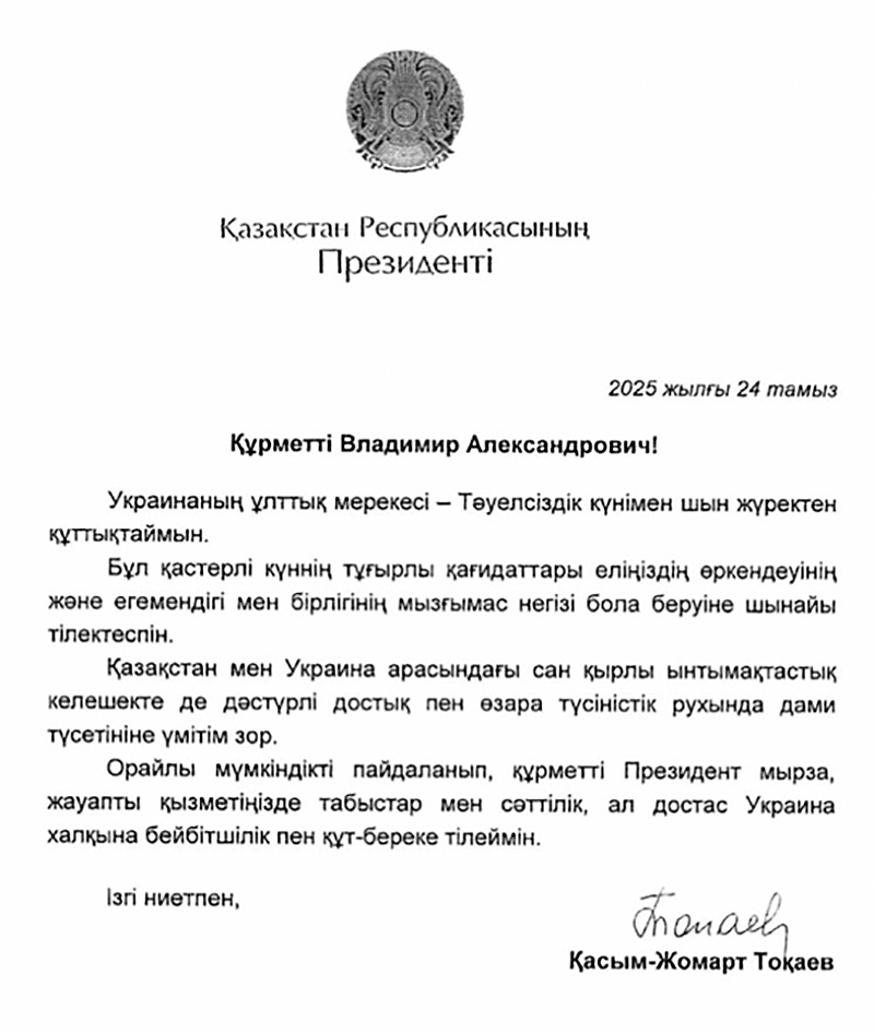 «Ҳурматли Владимир Александрович! Сизни Украинанинг миллий байрами – Мустақиллик куни билан чин қалбимдан табриклайман. Ушбу тантанали куннинг асосий тамойиллари бундан буён ҳам мамлакатингиз фаровонлиги, суверенитети ва бирлигининг мустаҳкам пойдевори бўлиб қолишини чин дилдан тилайман. Қозоғистон ва Украина ўртасидаги кўп қиррали ҳамкорлик бу анъанавий дўстлик келгусида ҳам анъанавий дўстлик, ўзаро ҳурмат руҳида ривожланиб боради, деган умиддаман. Фурсатдан фойдаланиб Сизга, жаноб Президент, масъулиятли фаолиятингизда муваффақият ва бахт-саодат, дўст Украина халқига эса тинчлик ва фаровонлик тилайман», — деб ёзган Қозоғистон президенти Қосим-Жомарт Тоўқаев. Оқўрда, шунингдек, унинг Зеленскийга хабар юборгани ҳақида хабар берган.