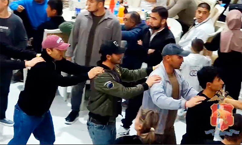 ИИВ бош бошқармаси тарқатган видеога кўра, залда кўплаб аёллар ва болалар бўлган. Росгвардия ходимлари зиёфат залидаги одамларни хизматчи итлар ёрдамида ҳужжатларини текширишган ва тинтув ўтказишган. Ҳуқуқ-тартибот идоралари ходимлари назорати остида бир гуруҳ эркаклар саф тортилиб, кейин залдан чиқариб юборилгани ҳам видеога олинган. Айрим одамларни қўлларини қайирган ҳолда полиция микроавтобусига мажбуран ўтқазишган.