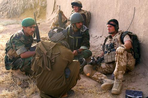 Британиялик ҳарбий Афғон миллий армияси аскари ва таржимони орқали маҳаллий аҳоли билан гаплашяпти, 2008 йил. wikipedia.org сайти фотосурати